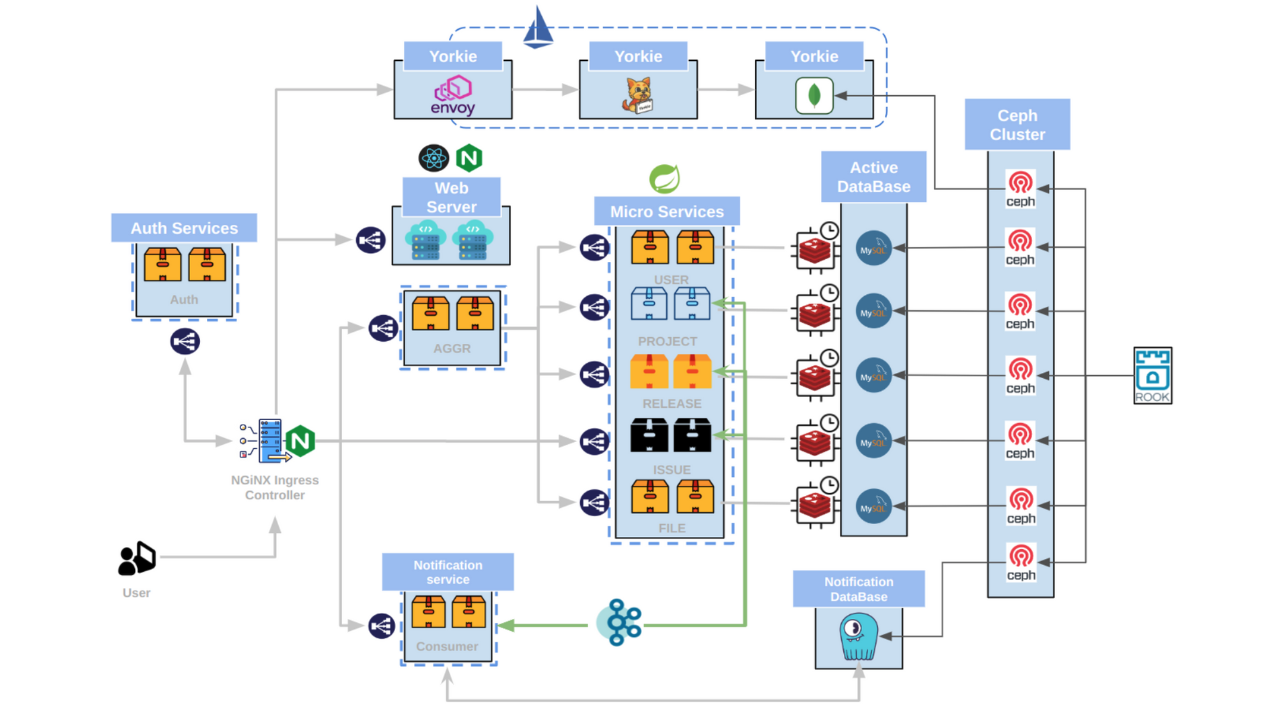 - Users are proxied to WS (WebSocket) and WAS (Web Application Server) through the nginx ingress controller.
