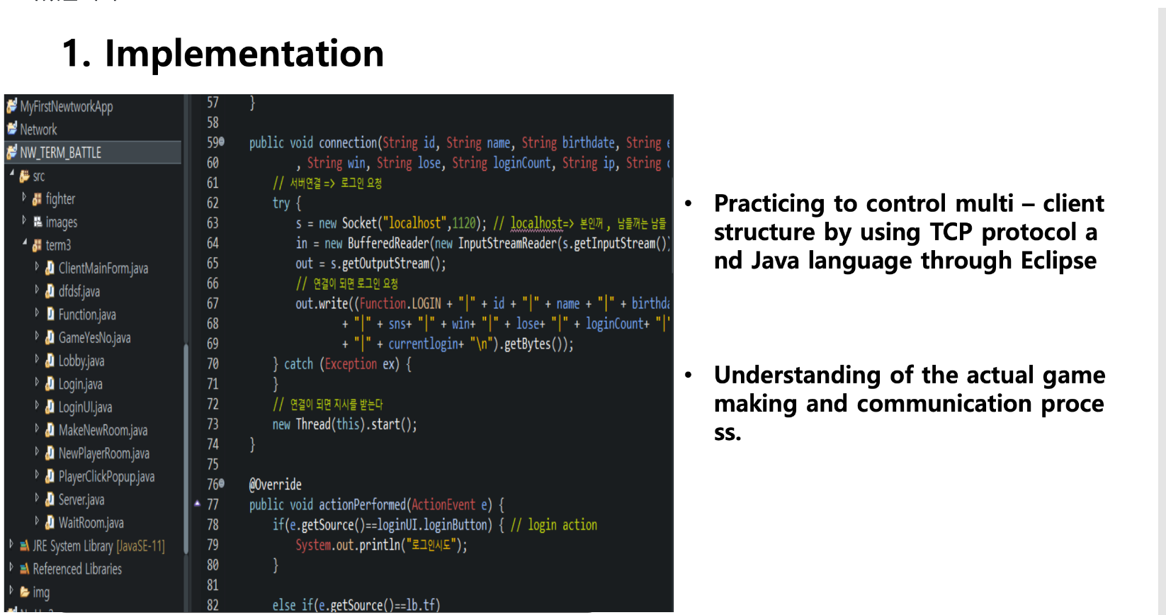 The team completed a one-on-one fighting game through networking. Each player's actions produce results in each turn, and as a result, the players' health decreases. The player with the lowest health loses the game. The project was completed using a Server-Client model, and the program mainly runs on communication through streams between the server and clients. Different actions are taken by the server and clients based on the messages' headers, which define the functions of each message. More details are available in the uploaded YouTube video and GitHub repository.
